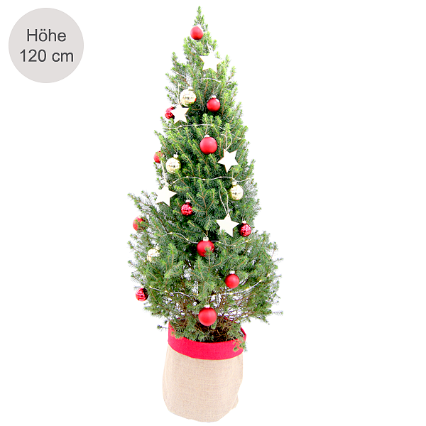 Das Besondere an diesem Weihnachtsbäumchen (ca. 120 cm) sind die matten und glänzenden Weihnachtskugeln (4-5 cm) in den Farben Rot und Gold. Zusammen mit den Holzsternen wirkt dieses Bäumchen sehr klassisch. Das stimmungsvolle Licht der 100er Lichterkette betont dies zusätzlich. Farblich abgestimmt gibt es einen Jutesack mit rotem Rand. Ein Highlight der Weihnachtsdekoration. Die Lichterkette ist mit Timerfunktion. Das Bäumchen kann nach der Weihnachtszeit ausgepflanzt werden.Hinweis: Du erhältst den Baum ungeschmückt. So kommst Du in den Genuss des Baumschmückens mit Deinen Liebsten.Hersteller:FloraPrima GmbHDidderser Str. 2838176 Wendeburginfo@floraprima.de