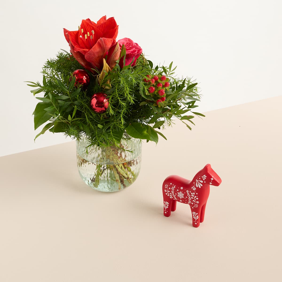 Rot und Grün sind die klassischen Farben in der Weihnachtszeit. Was liegt da also näher, als einen stimmungsvollen Blumenschmuck in diesen Farben zu kreieren? Unser Wiesenstrauß Weihnachtsgruß enthält prachtvolle Amaryllis, Salal, Wachsflower, elegante Rosen sowie Johanniskraut, Pistazienzweige, Sicheltanne und festliche Weihnachtskugeln. Der Durchmesser beträgt etwa 25 cm, die Stiellänge der Blumen liegt bei ca. 30 cm. Dieser süße Strauß wird zusammen mit einem roten Dekopferd an den Empfänger versandt. So sparst du dir den stressigen Einkauf in der Weihnachtszeit und hast gleich ein tolles Geschenk für deine Lieben parat. Wir wünschen dir und deinen Lieben schöne Weihnachten!