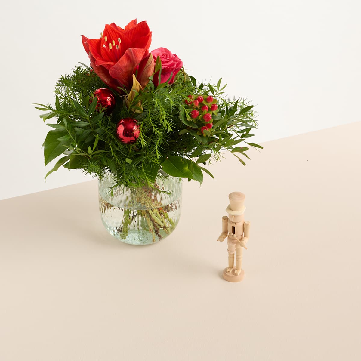 Rot und Grün sind die klassischen Farben in der Weihnachtszeit. Was liegt da also näher, als einen stimmungsvollen Blumenschmuck in diesen Farben zu kreieren? Unser Wiesenstrauß Weihnachtsgruß enthält prachtvolle Amaryllis, Salal, Wachsflower, elegante Rosen sowie Johanniskraut, Pistazienzweige, Sicheltanne und festliche Weihnachtskugeln. Der Durchmesser beträgt etwa 25 cm, die Stiellänge der Blumen liegt bei ca. 30 cm. Dieser süße Strauß wird zusammen mit einem Nussknacker (ca. 15 cm groß) an den Empfänger versandt. So sparst du dir den stressigen Einkauf in der Weihnachtszeit und hast gleich ein tolles Geschenk für deine Lieben parat. Wir wünschen dir und deinen Lieben schöne Weihnachten!