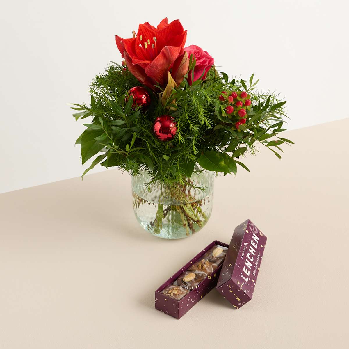 Rot und Grün sind die klassischen Farben in der Weihnachtszeit. Was liegt da also näher, als einen stimmungsvollen Blumenschmuck in diesen Farben zu kreieren? Unser Wiesenstrauß Weihnachtsgruß enthält prachtvolle Amaryllis, Salal, Wachsflower, elegante Rosen sowie Johanniskraut, Pistazienzweige, Sicheltanne und festliche Weihnachtskugeln. Der Durchmesser beträgt etwa 25 cm, die Stiellänge der Blumen liegt bei ca. 30 cm. Dieser süße Strauß wird zusammen mit Schoko-Lebkuchen Pralinen an den Empfänger versandt. So sparst du dir den stressigen Einkauf in der Weihnachtszeit und hast gleich ein tolles Geschenk für deine Lieben parat. Wir wünschen dir und deinen Lieben schöne Weihnachten!