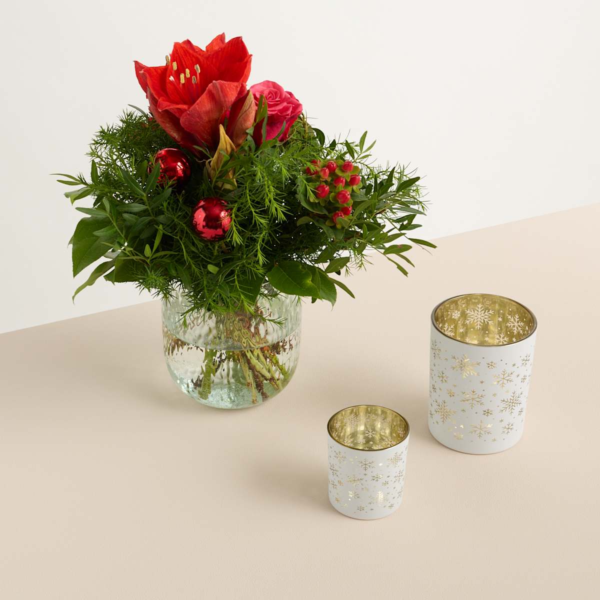 Rot und Grün sind die klassischen Farben in der Weihnachtszeit. Was liegt da also näher, als einen stimmungsvollen Blumenschmuck in diesen Farben zu kreieren? Unser Wiesenstrauß Weihnachtsgruß enthält prachtvolle Amaryllis, Salal, Wachsflower, elegante Rosen sowie Johanniskraut, Pistazienzweige, Sicheltanne und festliche Weihnachtskugeln. Der Durchmesser beträgt etwa 25 cm, die Stiellänge der Blumen liegt bei ca. 30 cm. Dieser süße Strauß wird zusammen mit einem Windlicht-Set an den Empfänger versandt. So sparst du dir den stressigen Einkauf in der Weihnachtszeit und hast gleich ein tolles Geschenk für deine Lieben parat. Wir wünschen dir und deinen Lieben schöne Weihnachten!