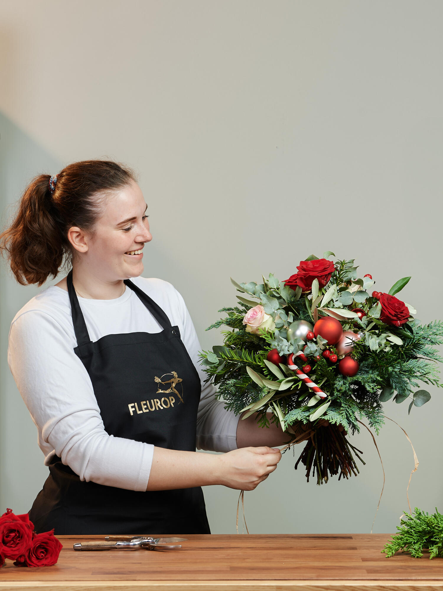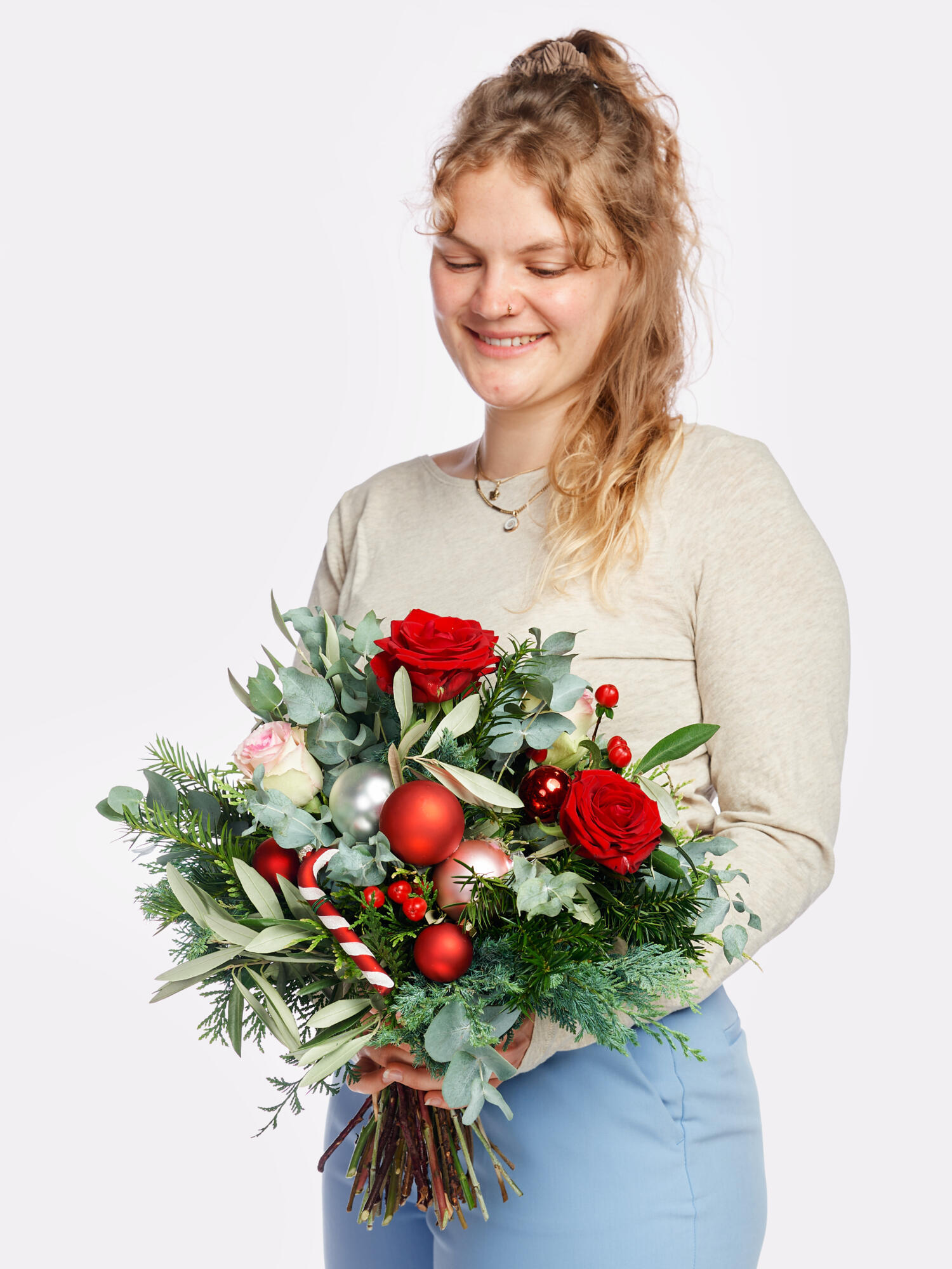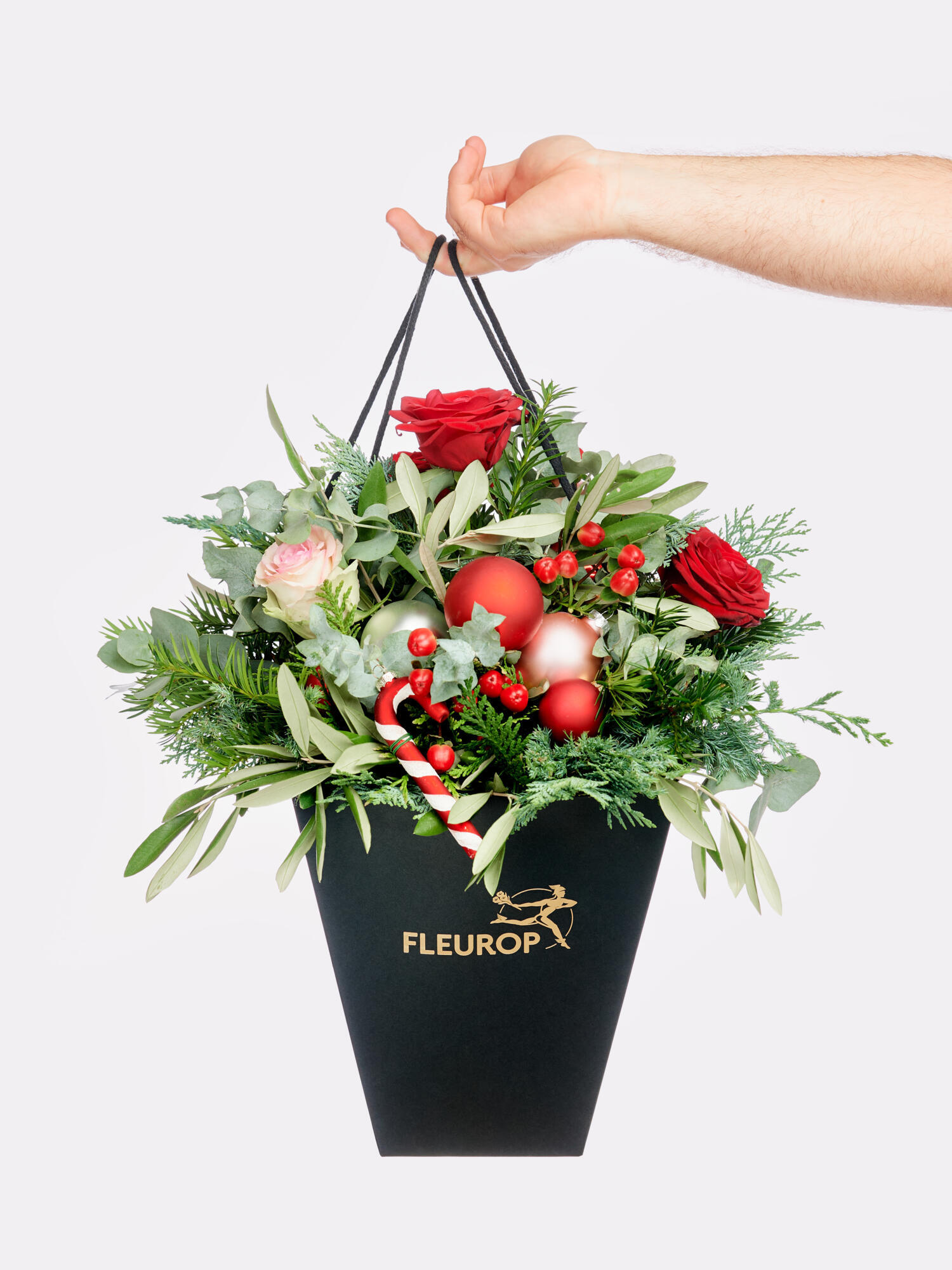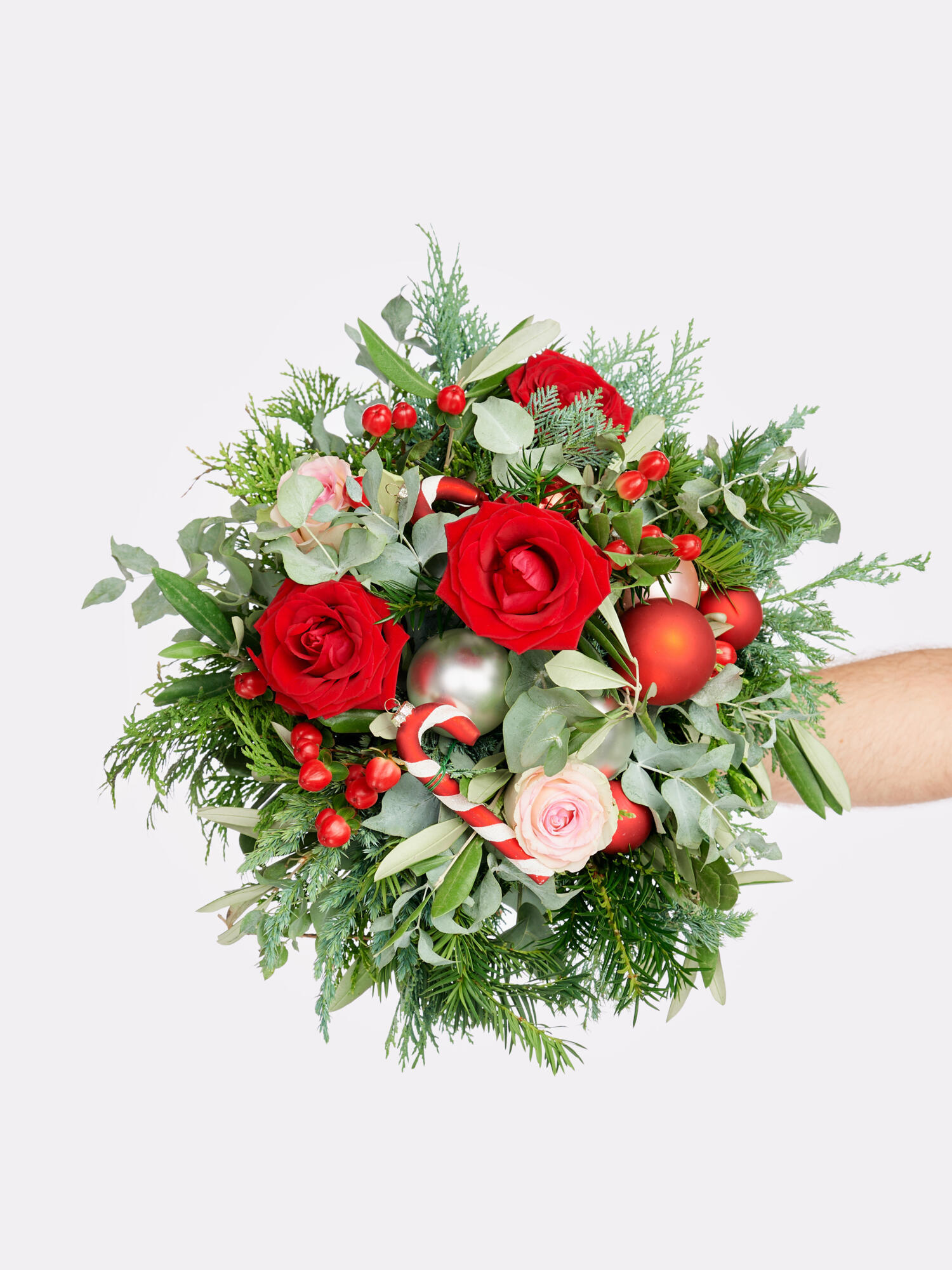 Verschicken Sie romantische Weihnachtsgrüße in Form dieses Blumenstraußes! Die Kombination aus rotem Hypericum, rosa und roten Rosen sorgt für Lebendigkeit. Koniferen, Eukalyptus und Oliven geben dem Strauß einen winterlichen Touch. Geschmückt mit Glaskugeln in Weiß, Rot und Rosa und einer gläsernen Zuckerstange, erhält der Strauß einen besonderen weihnachtlichen Charme. Perfekt, um die Adventszeit zu feiern und ein wenig Festlichkeit ins Haus zu bringen!