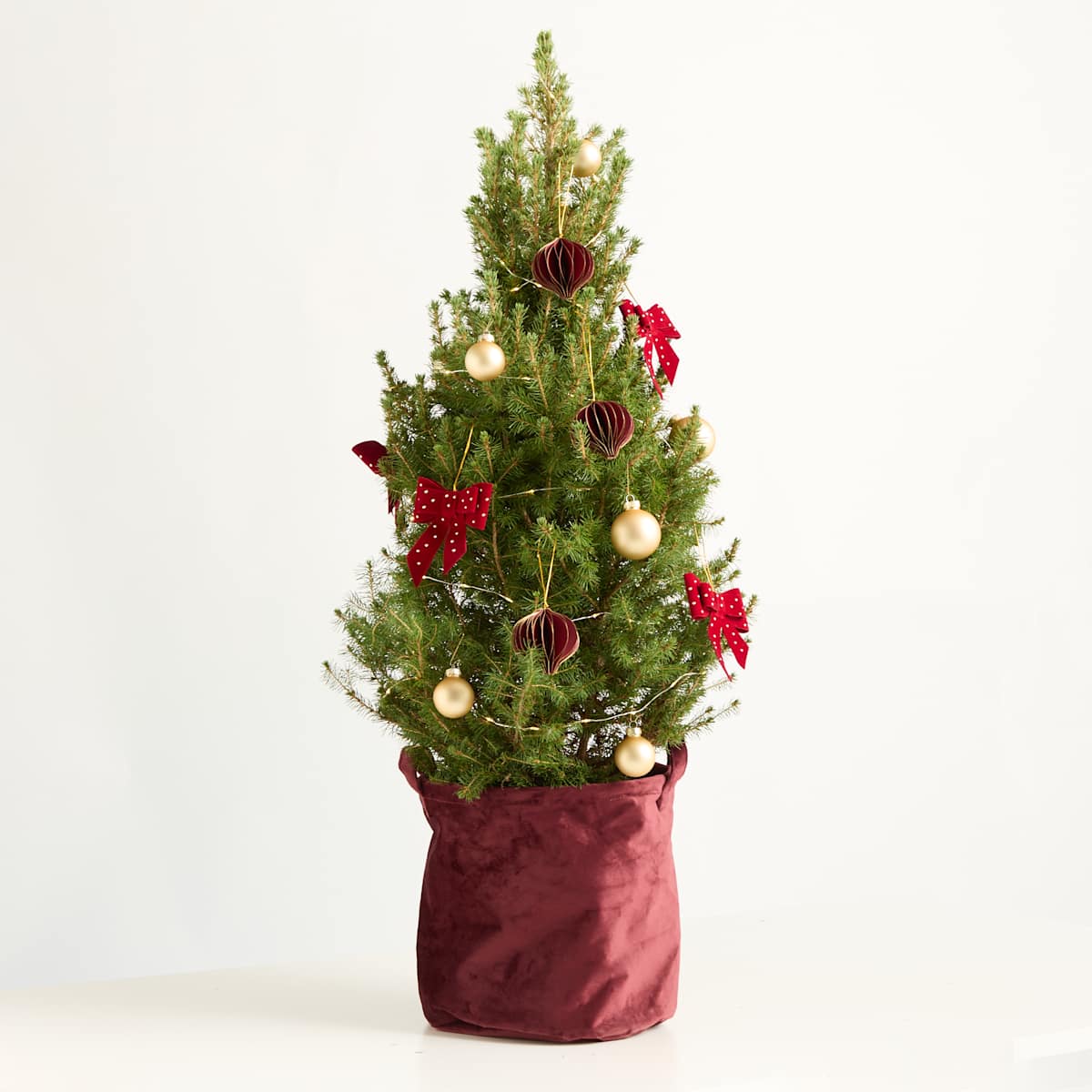 Was wäre die Weihnachtszeit ohne einen reich geschmückten Tannenbaum? Unser Bäumchen Weihnachtswunder sorgt für Gemütlichkeit im Kreis deiner Liebsten. Du musst nur den Schmuck und die Lichterkette anbringen – schon erstrahlt er in festlichem Glanz. Die Höhe der Fichte liegt bei ca. 75 cm, der Topfdurchmesser beträgt ca. 23 cm. Du erhältst das Bäumchen in einem rotfarbenen Samt-Korb. Der Schmuck besteht aus 12 weihnachtlichen Christbaumkugeln, 5 Samt-Schleifen und 5 Papieranhängern. Für die stimmungsvolle Beleuchtung sorgen 100 LEDs. Stelle den Tannenbaum nicht direkt vor die Heizung und halte den Erdbereich gleichmäßig feucht. Besonders wohl fühlt er sich im Hauseingang oder in deinem Wohnzimmer. Ein hübscher Anblick in dieser wundervollen, besinnlichen Zeit.