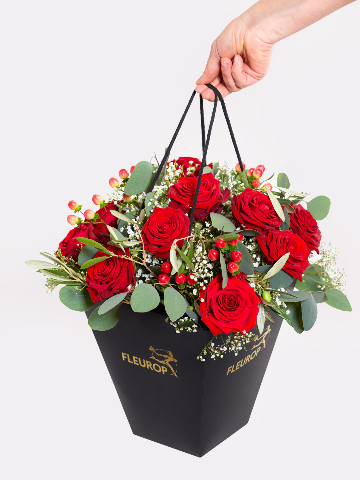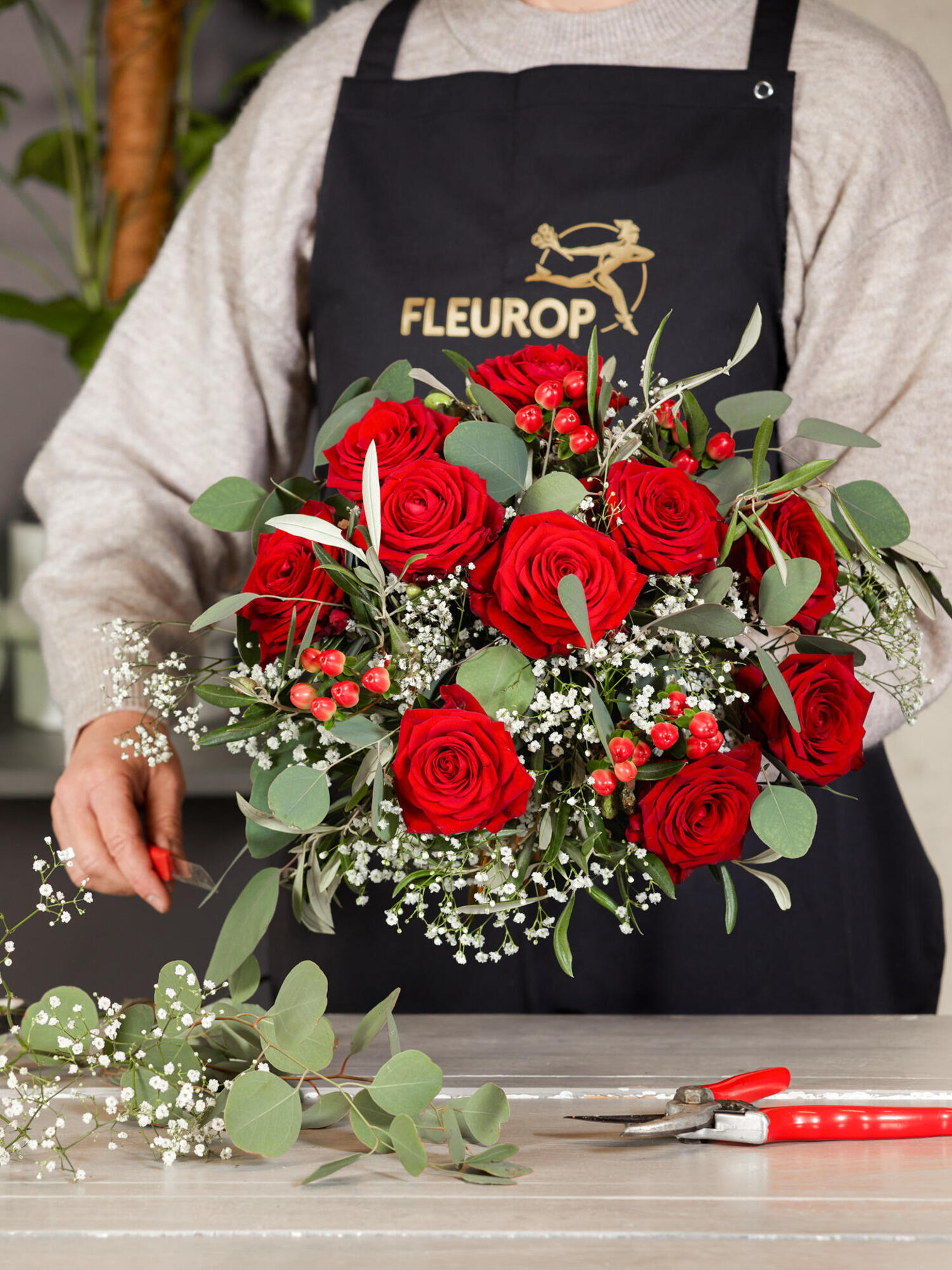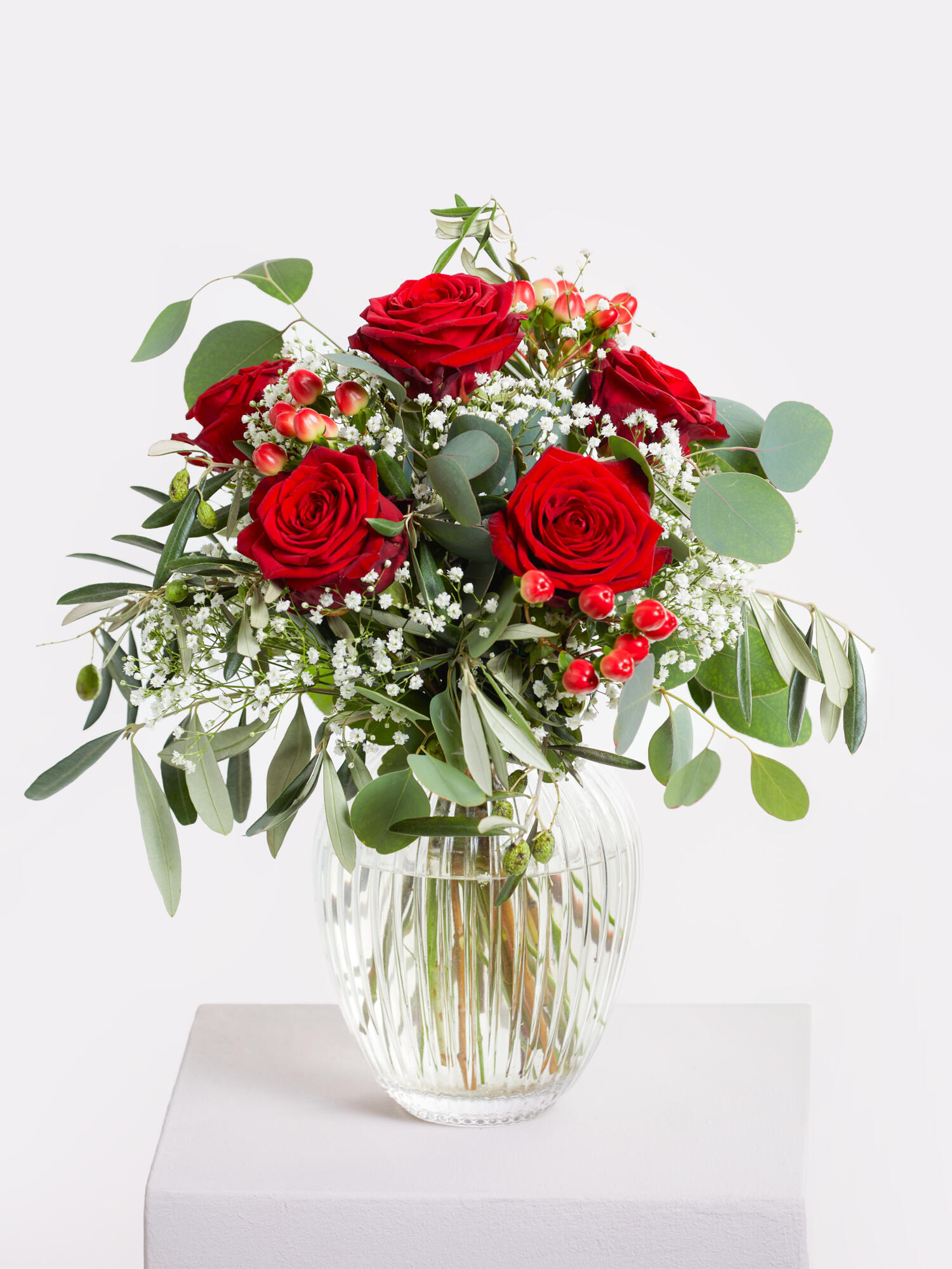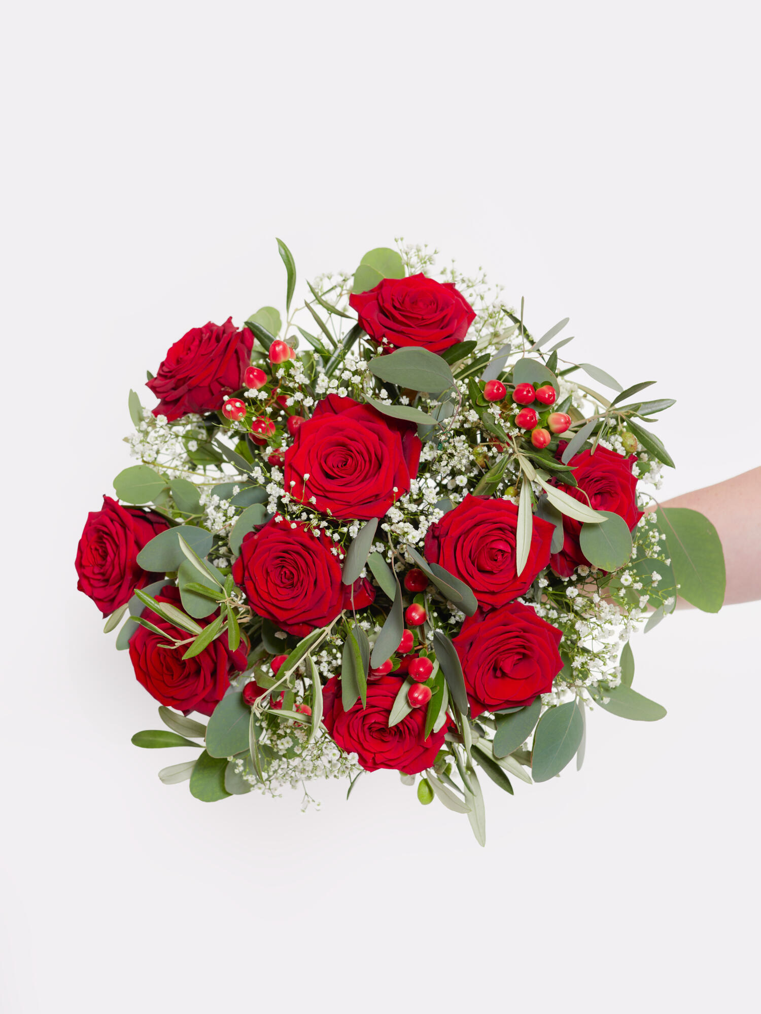 Locker gebundener Strauß in Rot mit Rosen, Hypericum und Schleierkraut. Als Beiwerk werden Eukalyptus und Olive verwendet.