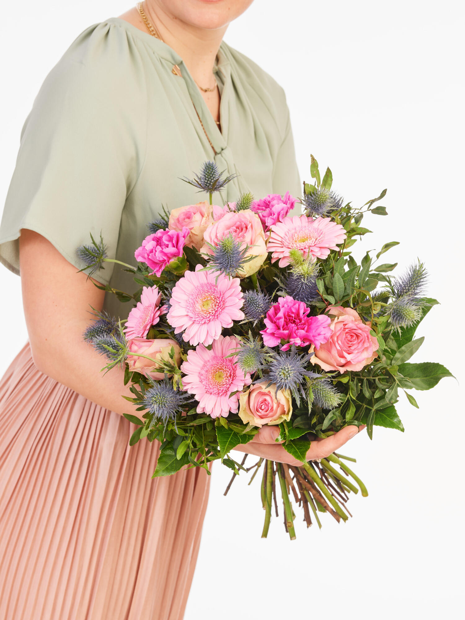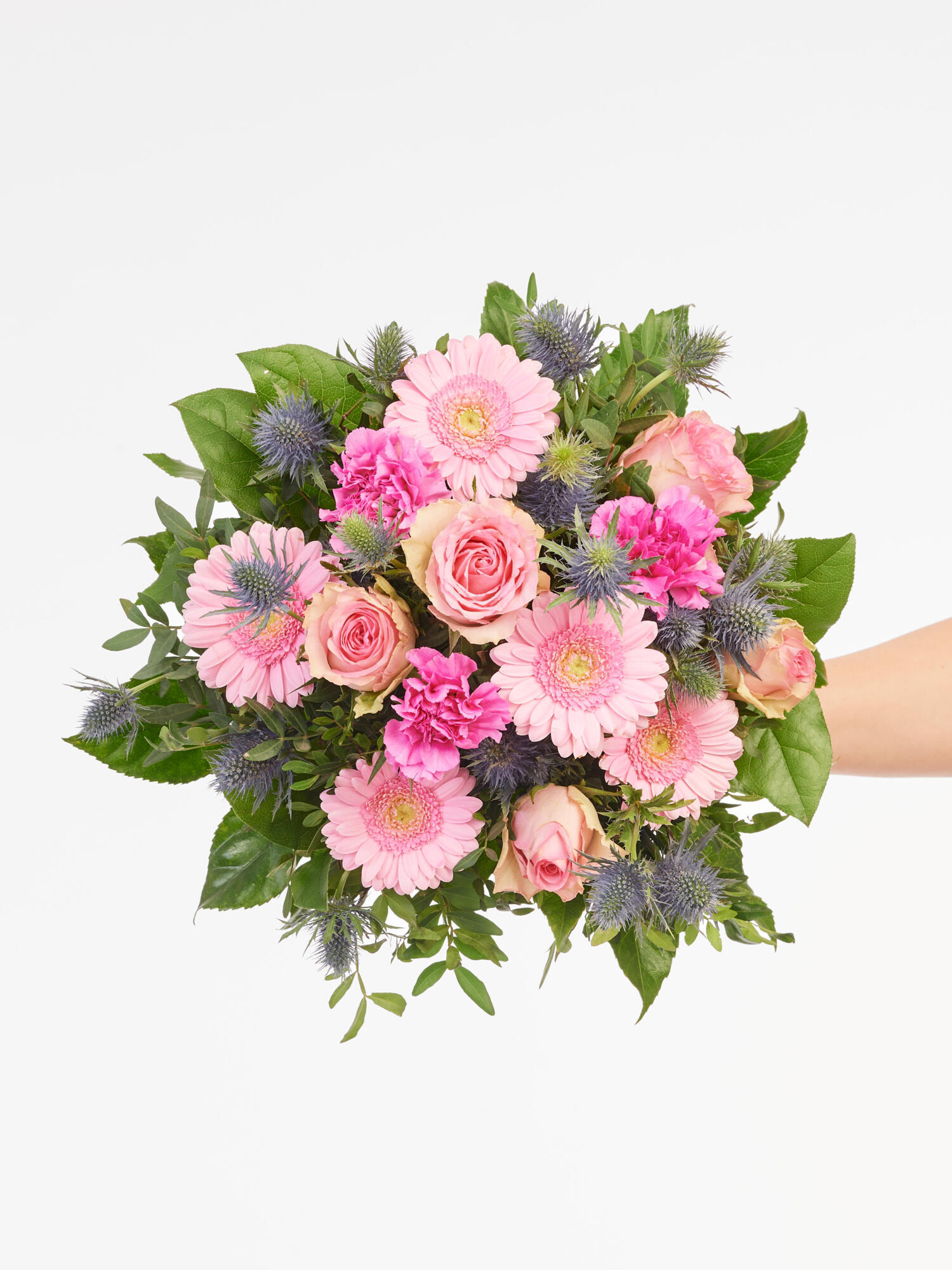 Zeigen Sie jemandem, dass Sie an sie/ihn denken: mit einem Blumengruß von Fleurop! Rund gebundener Strauß in Rosa-Pink-Blau mit Rosen, Germini, Nelken und Disteln. Als Beiwerk werden Pistazie, Aralie und Salal verwendet.