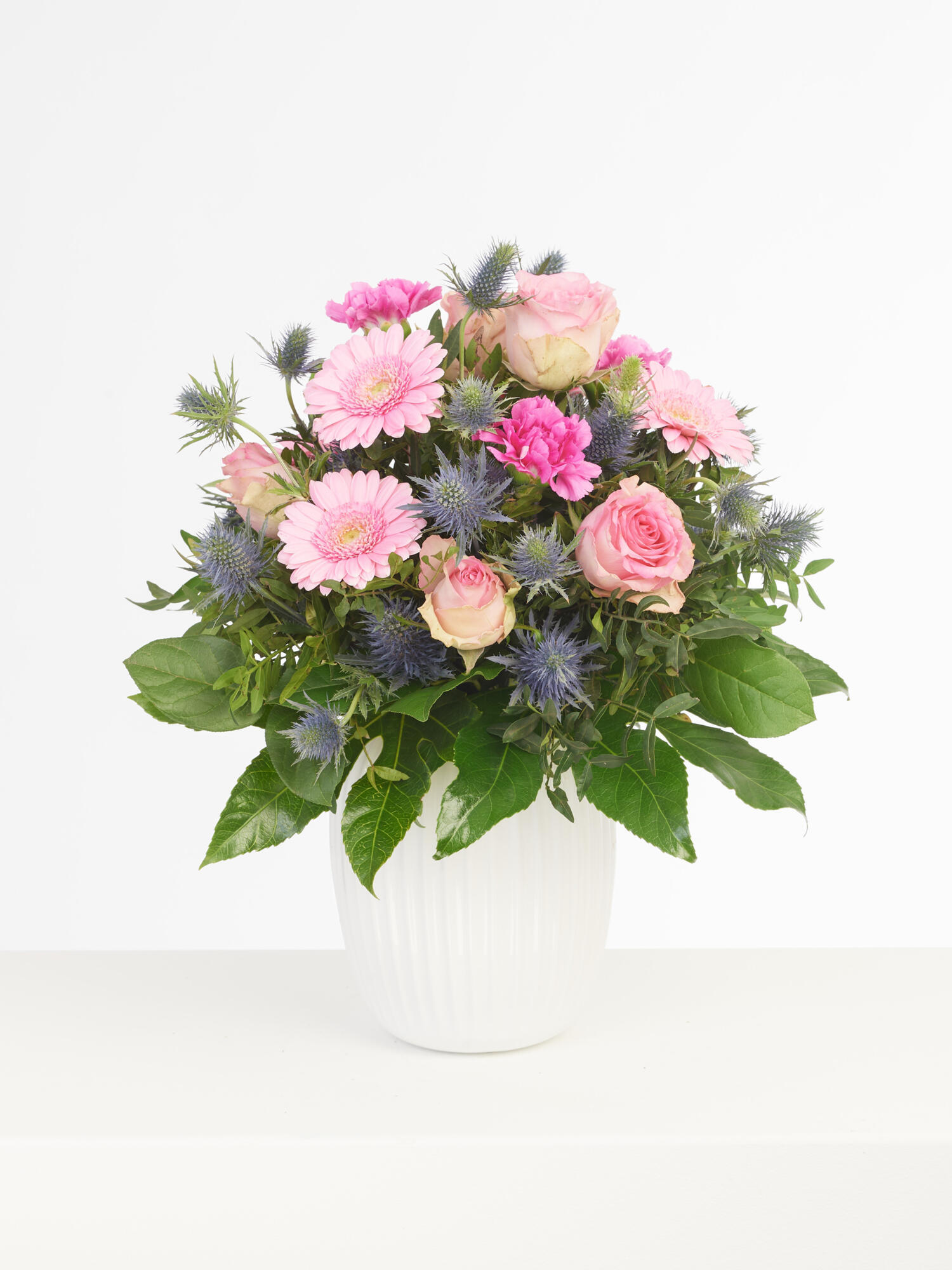Zeigen Sie jemandem, dass Sie an sie/ihn denken: mit einem Blumengruß von Fleurop! Rund gebundener Strauß in Rosa-Pink-Blau mit Rosen, Germini, Nelken und Disteln. Als Beiwerk werden Pistazie, Aralie und Salal verwendet.