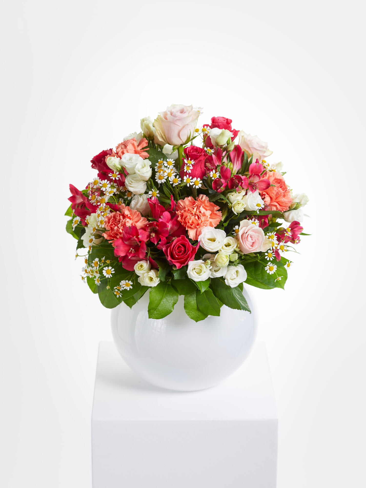 Rund gebundener Strauß in Pink-Apricot-Weiß mit Nelken, Rosen, Inkalilien (Alstromerien), Kamille und Eustoma. Als Beiwerk werden Pistazie und Salal verwendet.