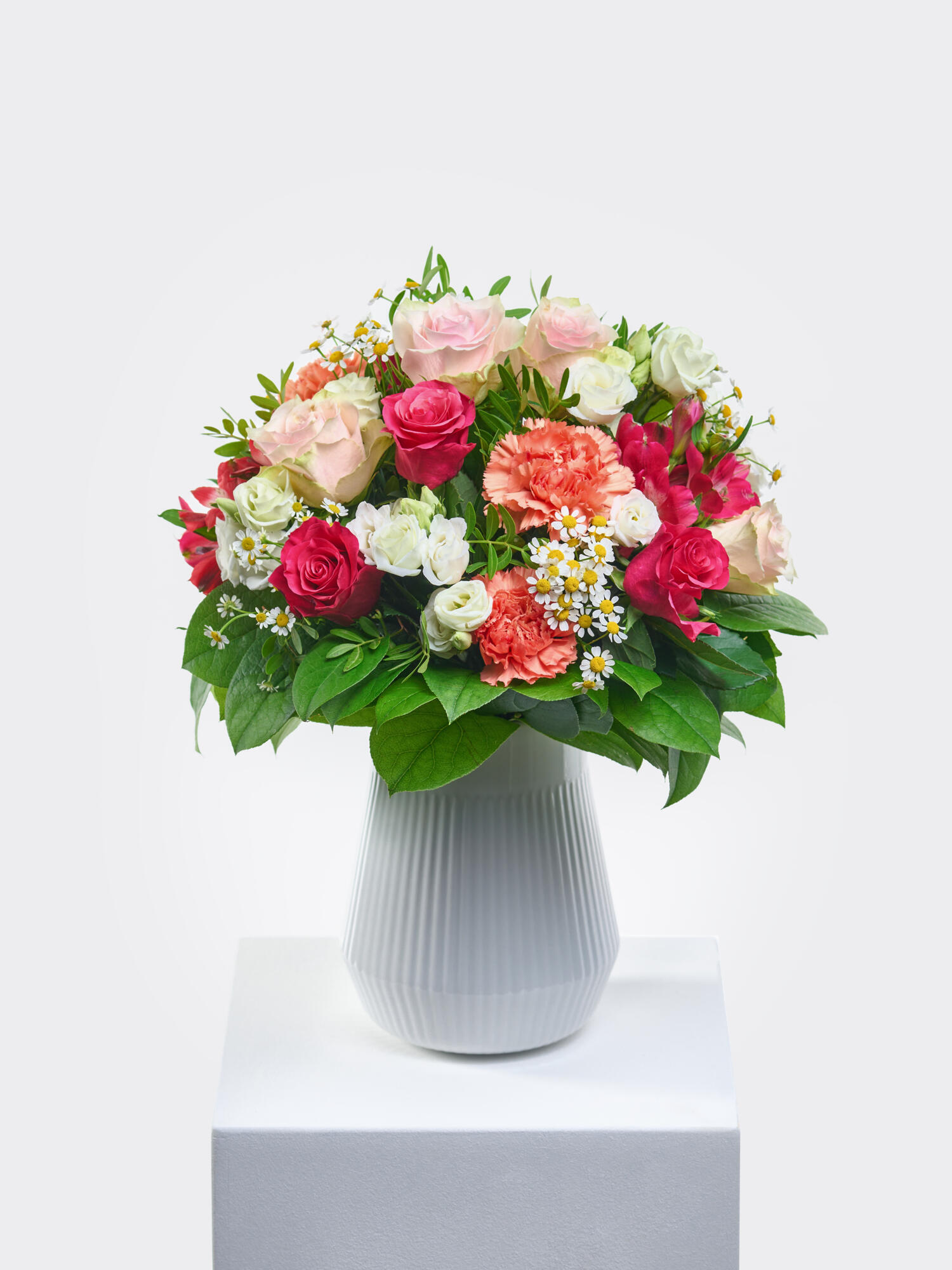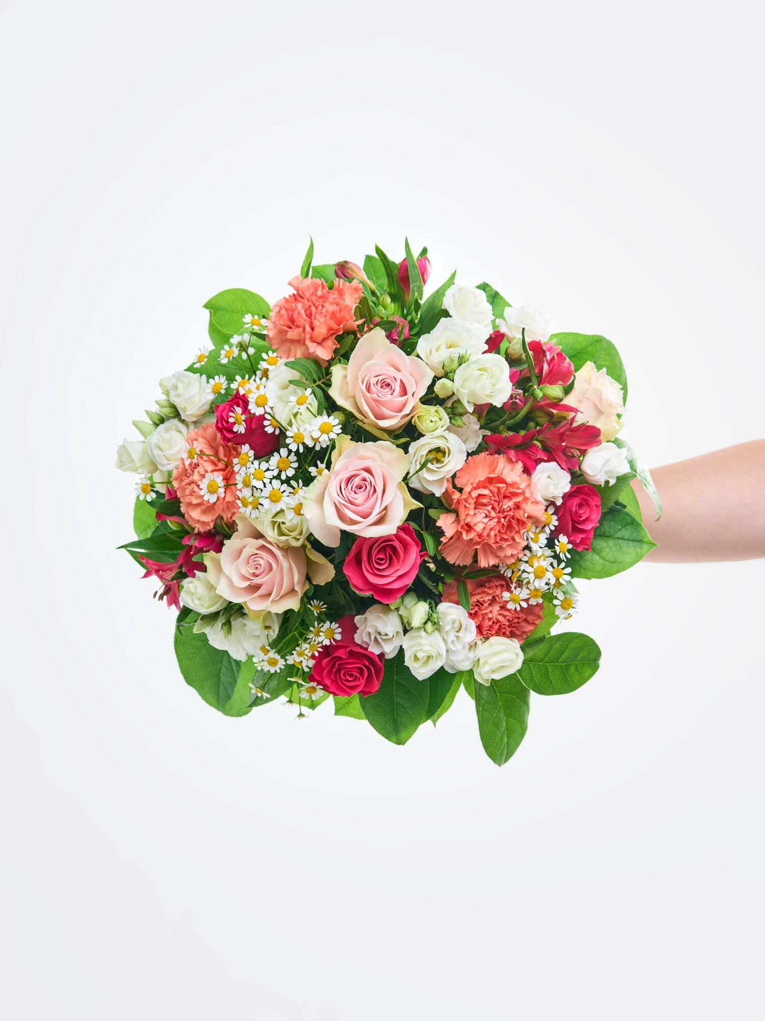 Rund gebundener Strauß in Pink-Apricot-Weiß mit Nelken, Rosen, Inkalilien (Alstromerien), Kamille und Eustoma. Als Beiwerk werden Pistazie und Salal verwendet.