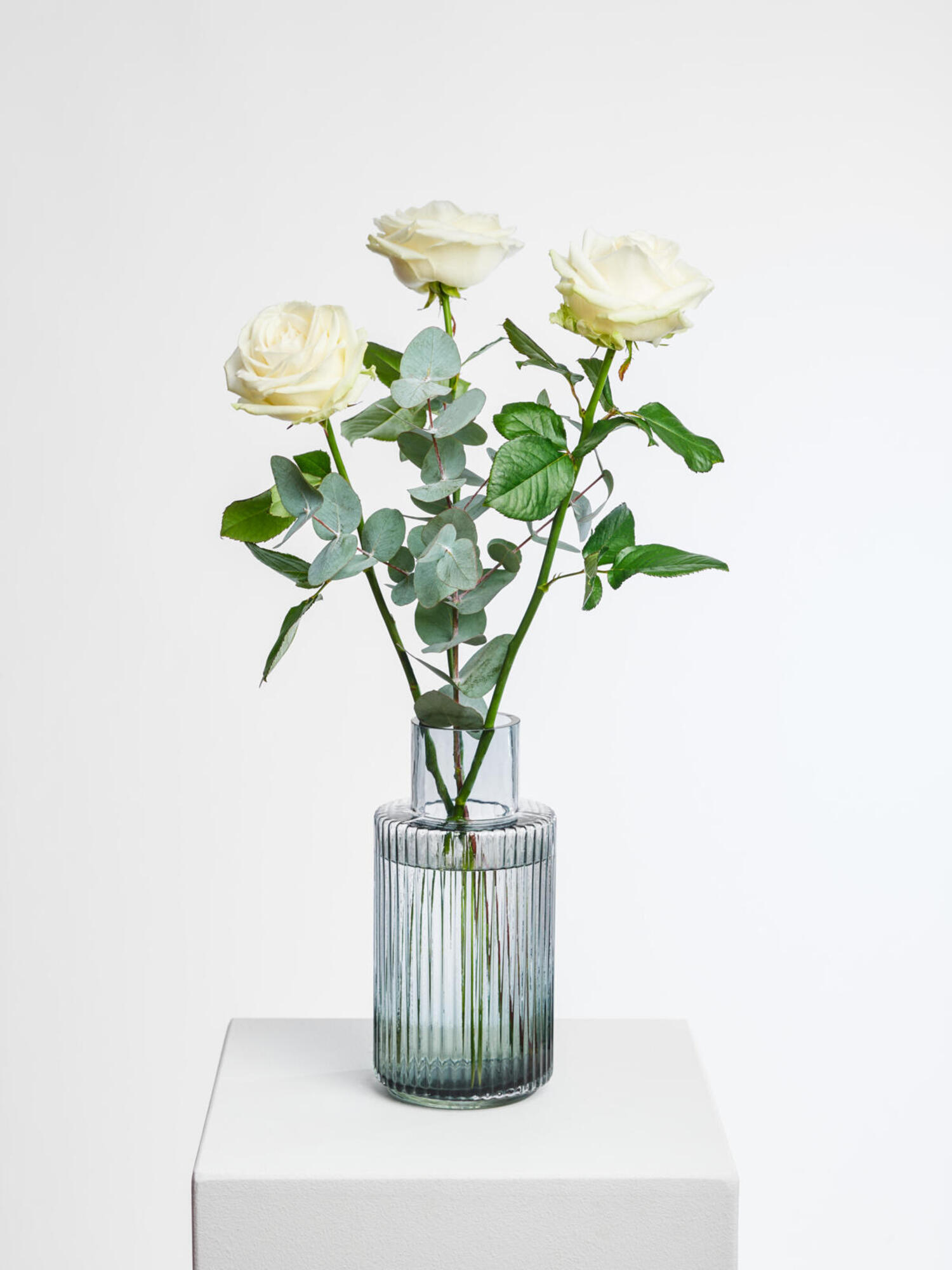 Weiße Rosen stehen für Ruhe und Eleganz und eignen sich daher perfekt als Geschenk zur Hochzeit oder auch zu anderen Anlässen. 3 weiße Rosen mit etwas Eukalyptus zum Selbstarrangieren. Stilecht verpackt im Fleurop-Karton.