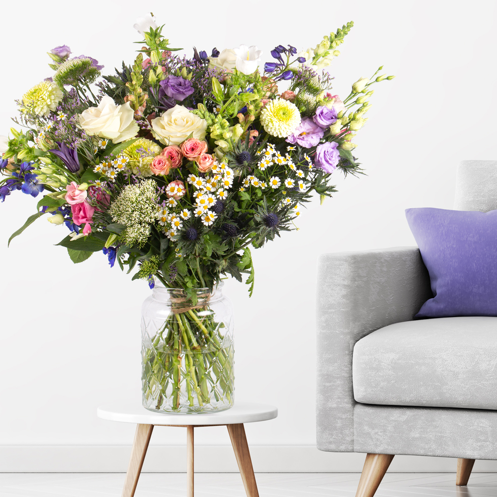 Hol dir den Duft des Sommers nach Hause Wenn wir an den Sommer denken, dann träumen wir von einer wild blühenden Wiese in den schönsten Farben. Mit unserem bunten XXL Blumenstrauß holst du dir dieses Gefühl nach Hause – und schmückst damit deinen Schreibtisch, die Tafel bei deinem Gartenfest und jeden anderen Platz, dem Du einen bunten Farbtupfer verpassen möchtest. Du willst diesen bunten Wiesenstrauß doch lieber verschenken? Dann nichts wie los – er eignet sich als blumiges Geschenk für Geburtstage, Beförderungen oder auch einfach mal als liebe Geste für zwischendurch. Premium-Rosen und Strauchrosen strahlen um die Wette und werden ergänzt durch sanft duftenden Strandflieder, Glockenblumen und Kamille. Aber damit noch nicht genug: Auch kleine Löwenmäulchen haben ihren großen Auftritt in Kombination mit Disteln, Lisianthus und weiteren besonderen Blüten.