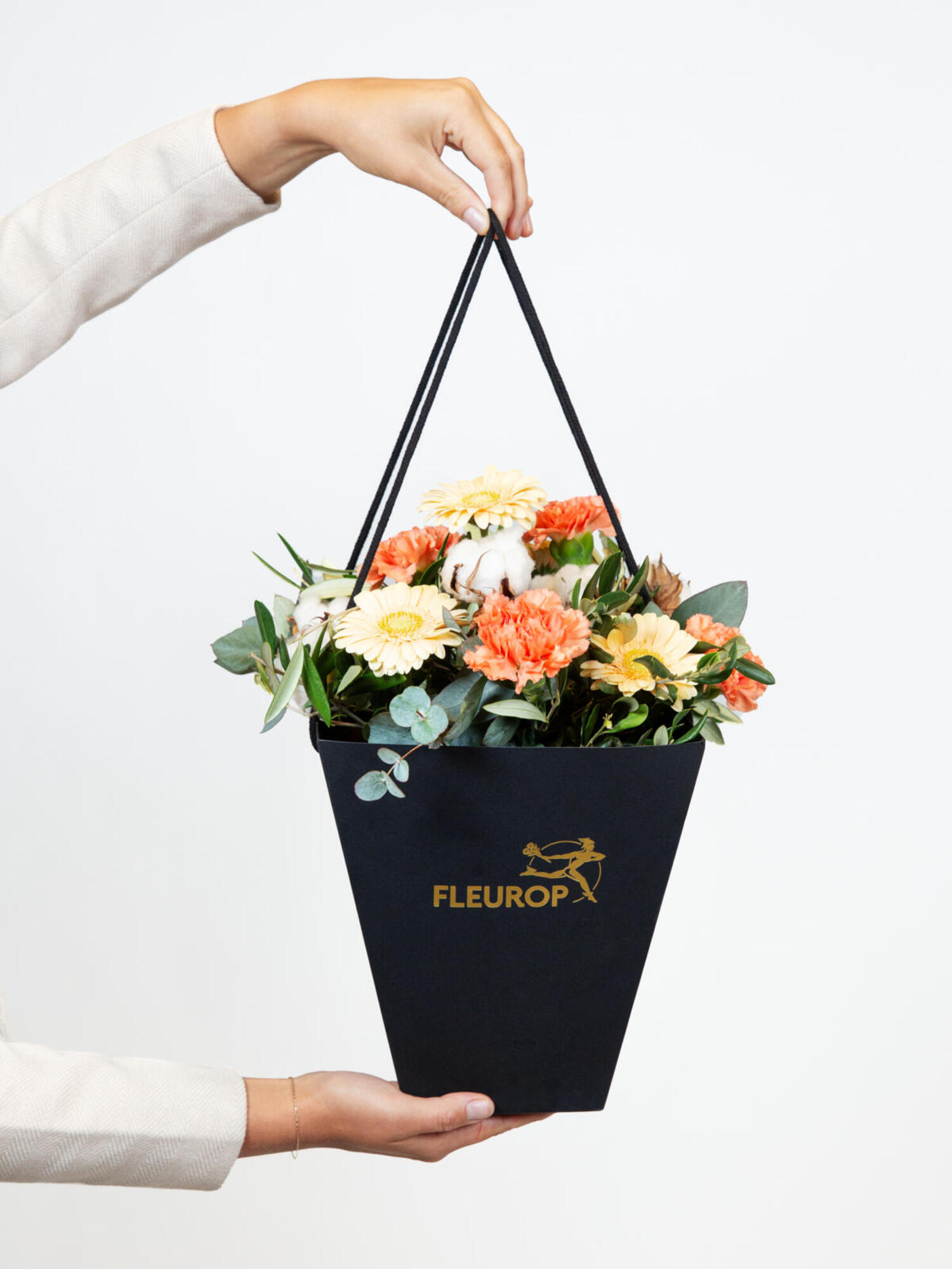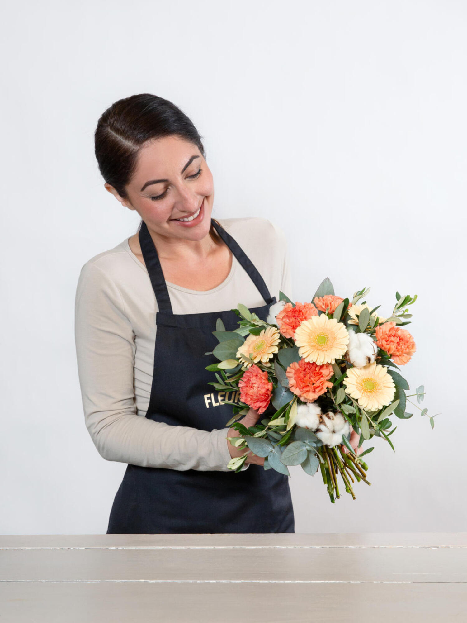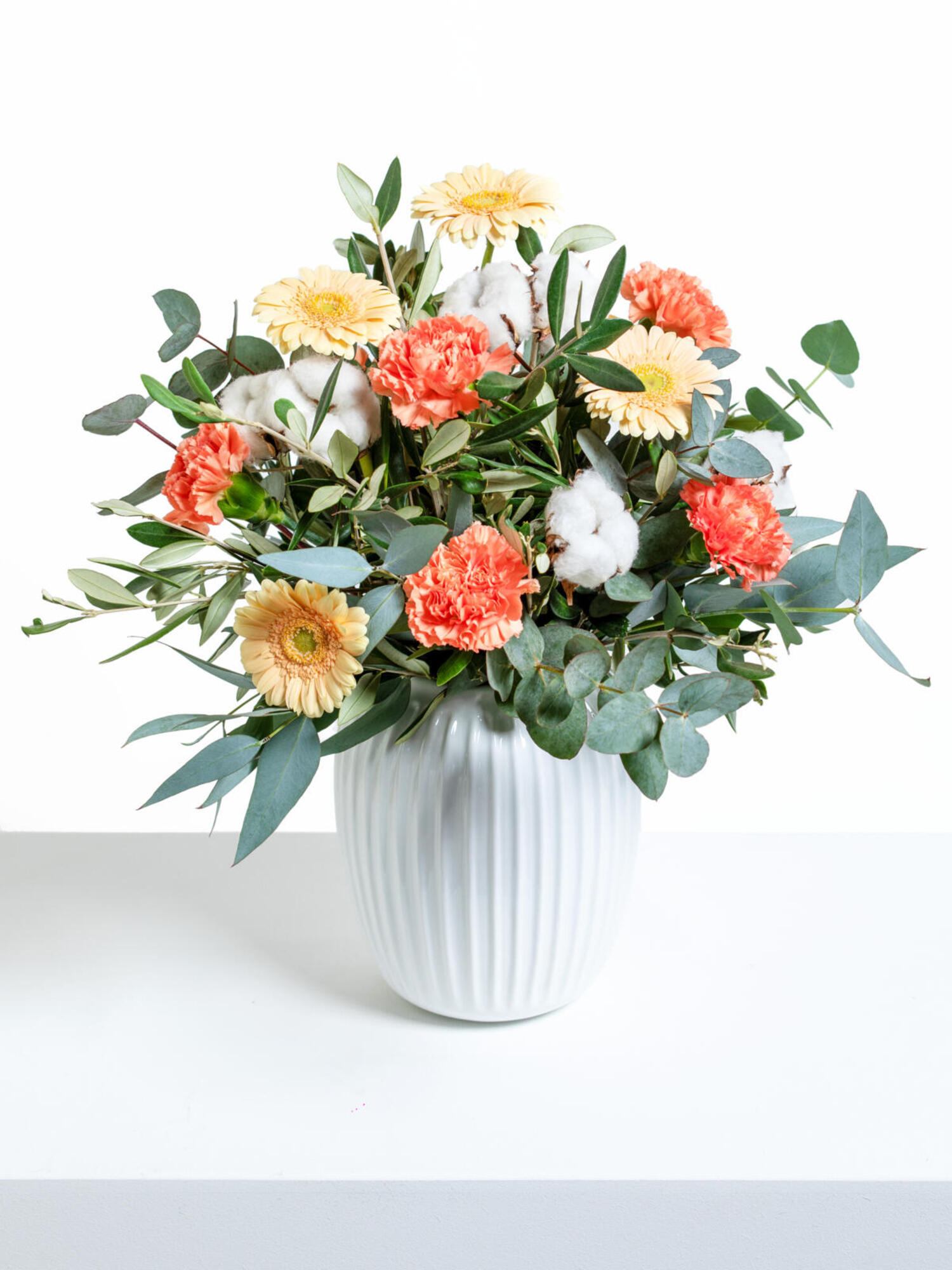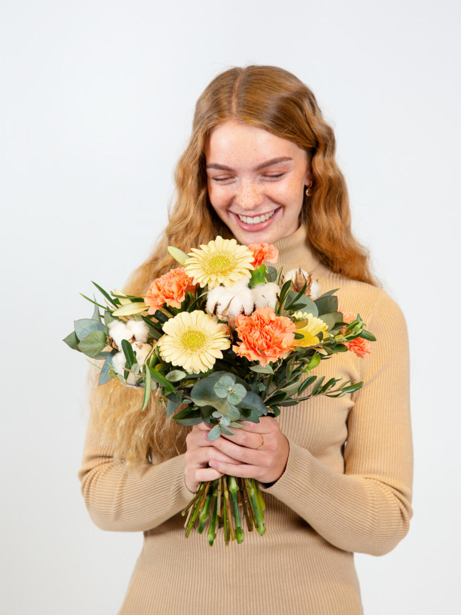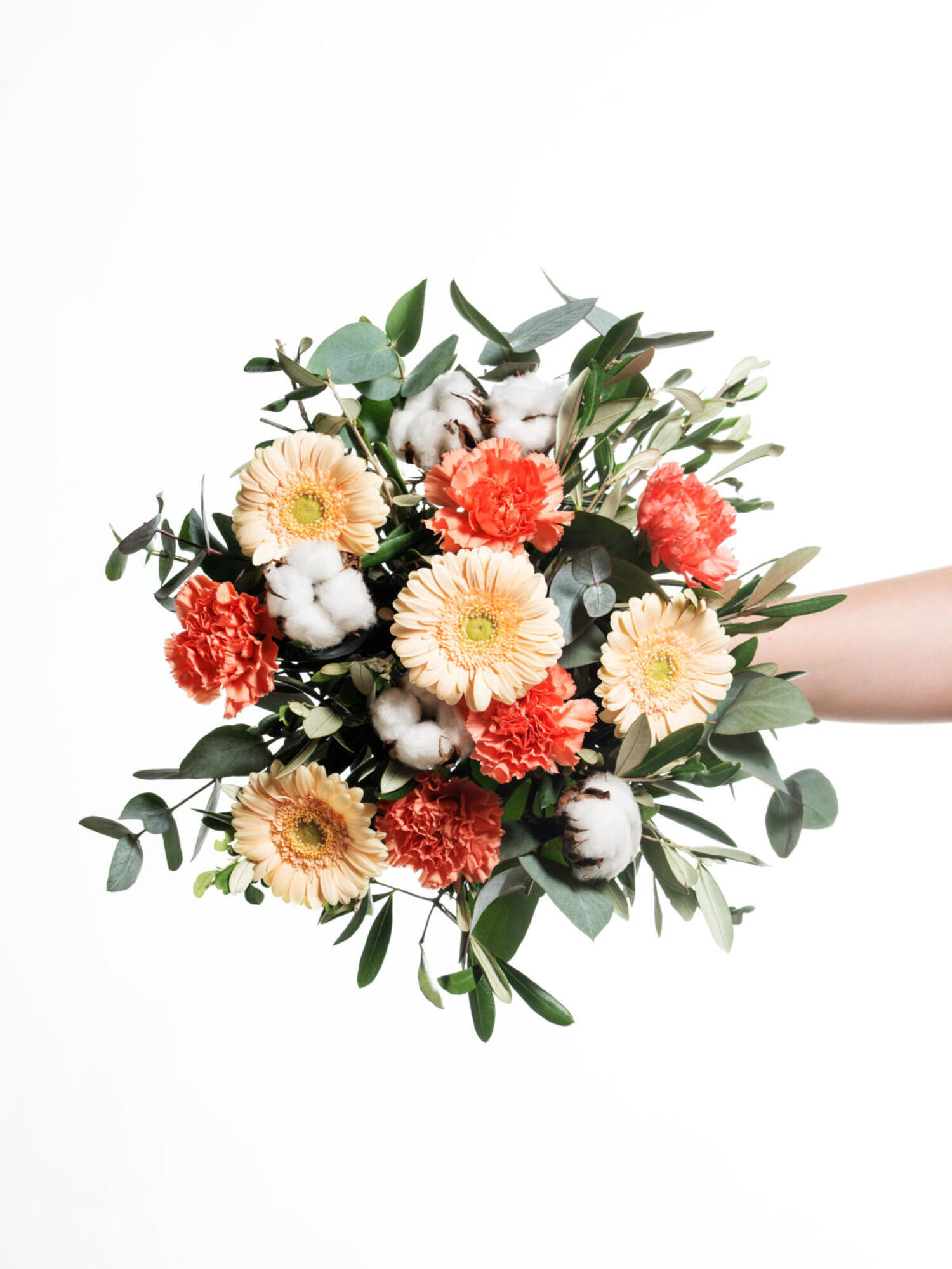 Rund gebundener Strauß in Apricot-Orange-Weiß mit Germini, Nelken und Baumwolle. Als Beiwerk werden Olive und Eukalyptus verwendet.