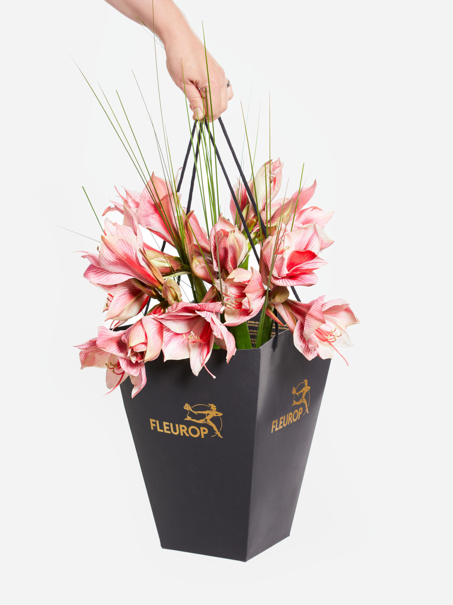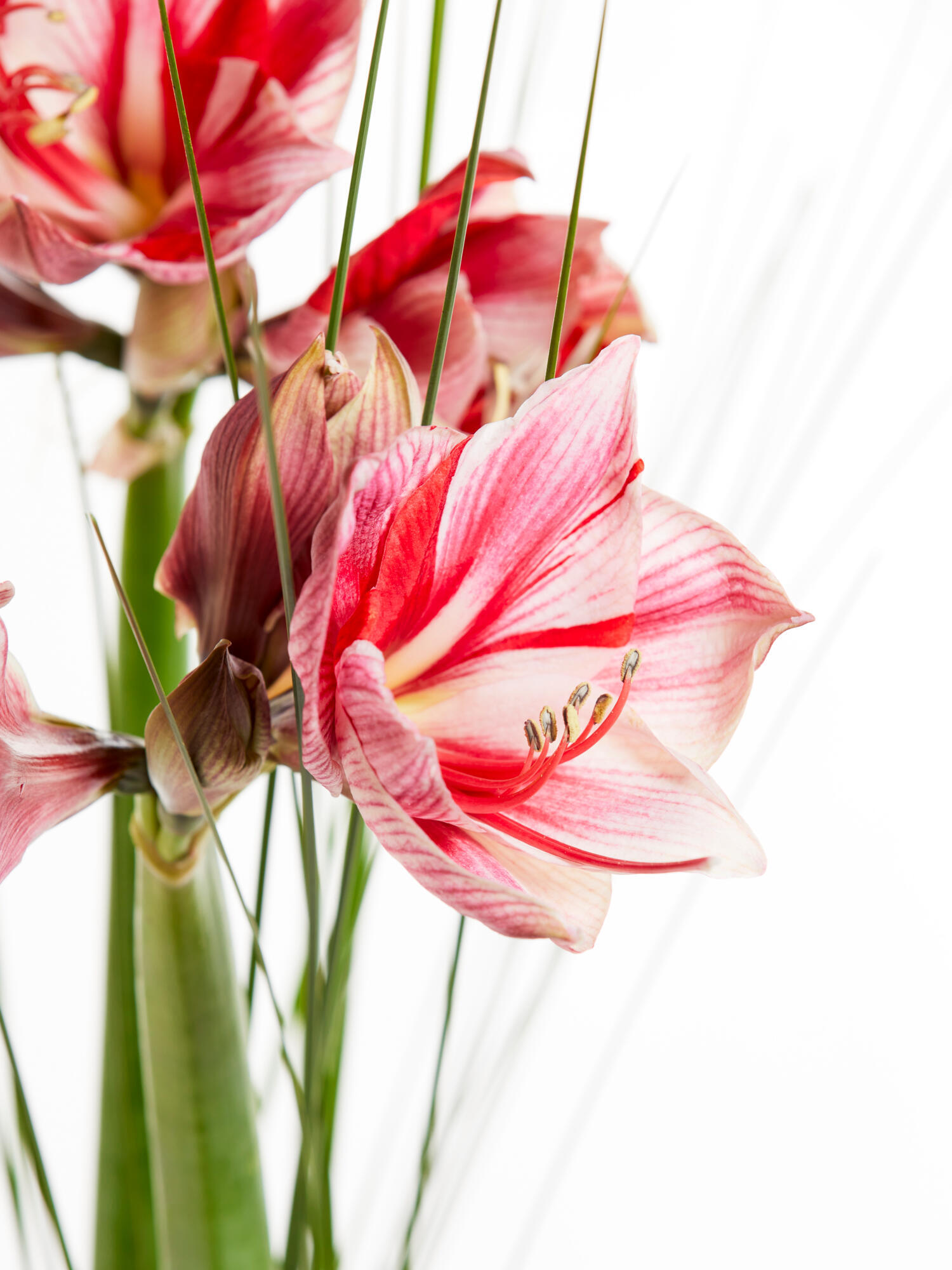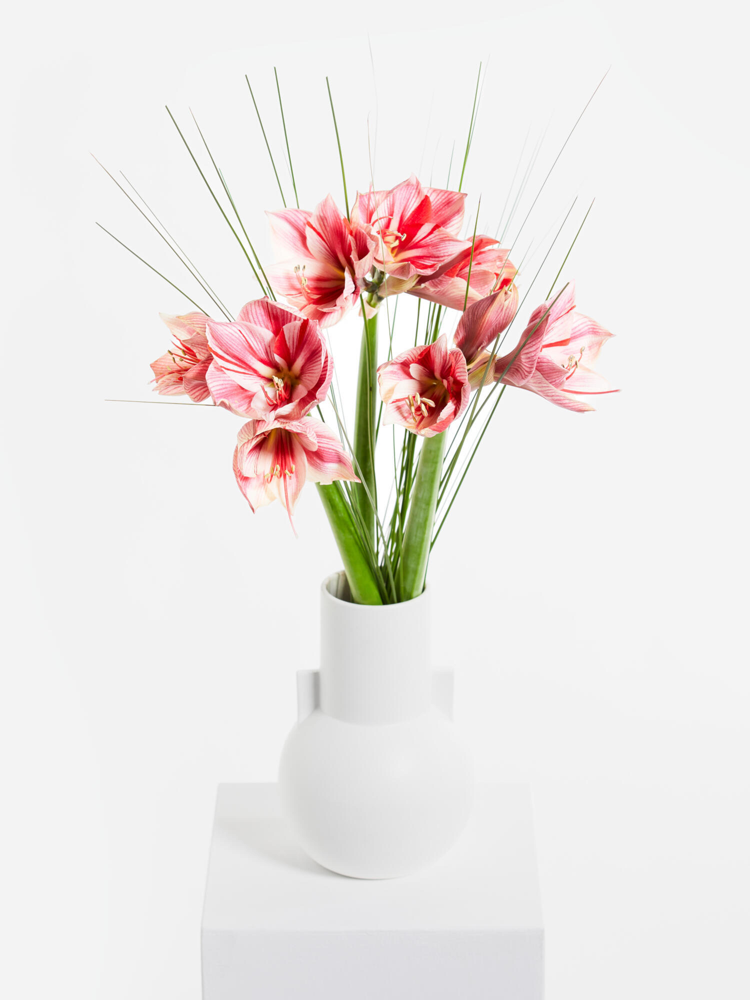 Schicken Sie einen fröhlichen Wintergruß auf die Reise. Lang gebundener Amaryllisstrauß in Pink-Weiß mit Stielgras als Beiwerk. Bei geschlossenen Amaryllis kann das vollständige Aufblühen bis zu 2-4 Tagen dauern.