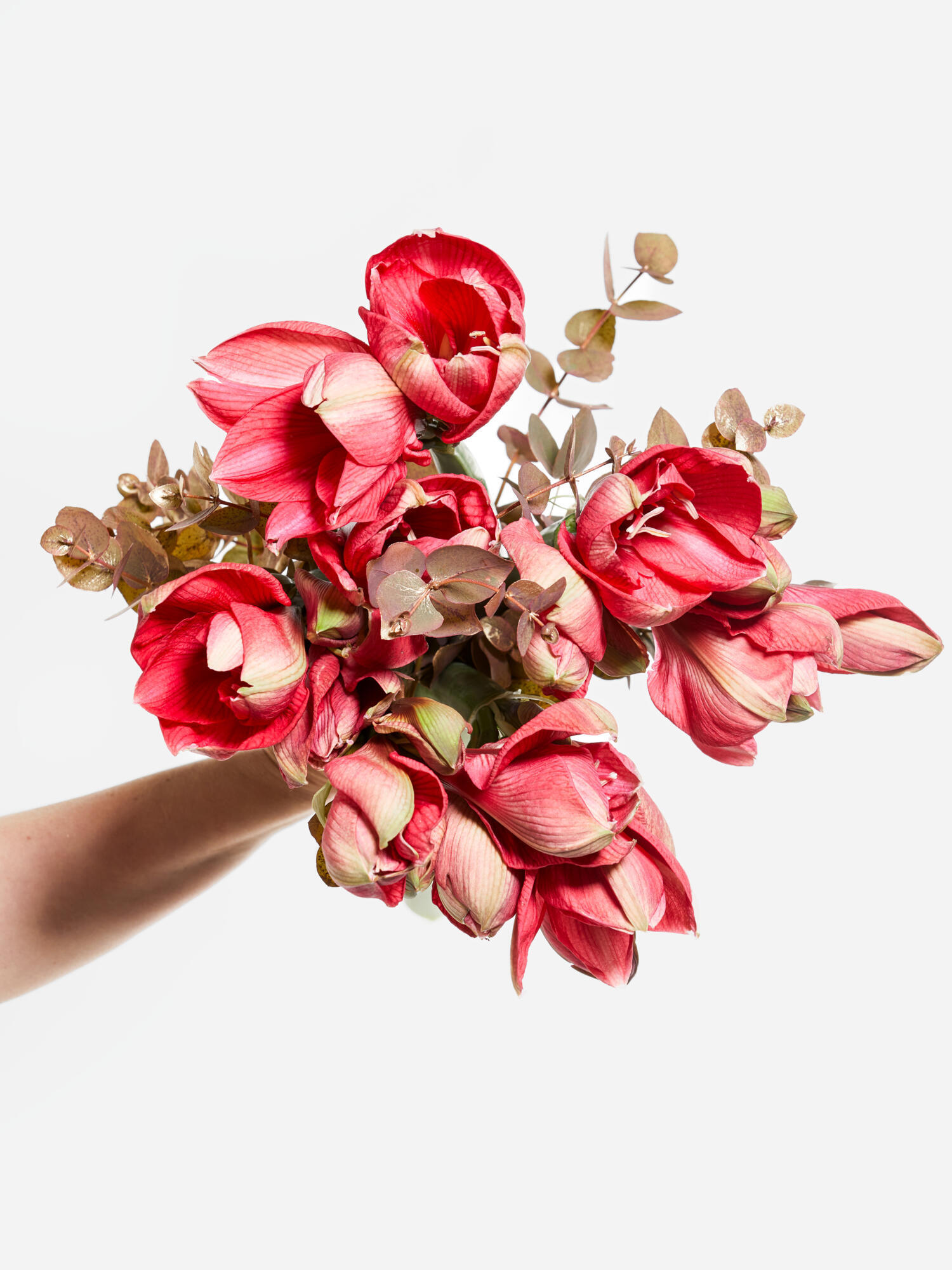 Lang gebundener Amaryllisstrauß in Pink mit leicht golden gefärbtem Eukalyptus als Beiwerk. Bei geschlossenen Amaryllis kann das vollständige Aufblühen bis zu 2-4 Tagen dauern.