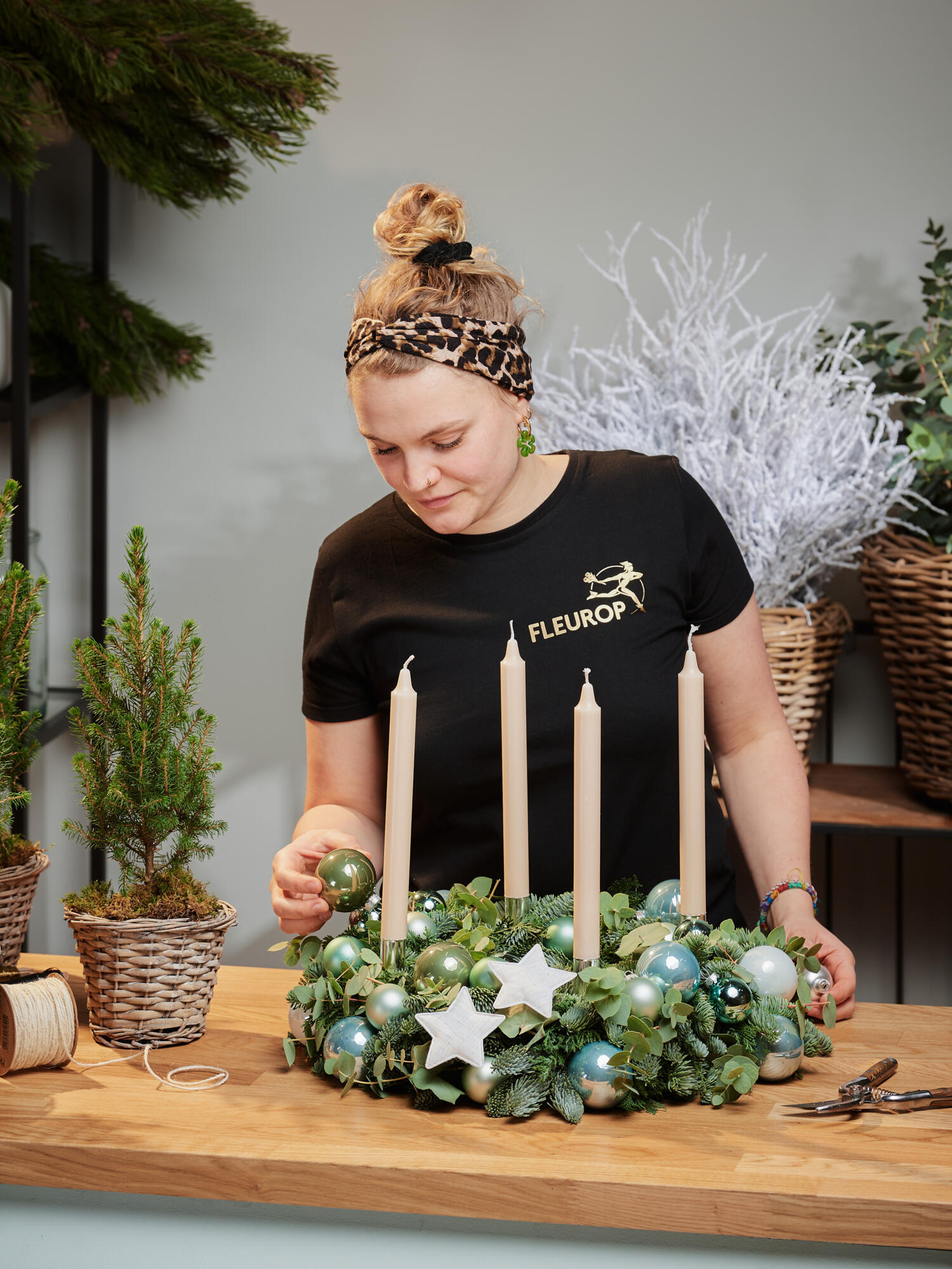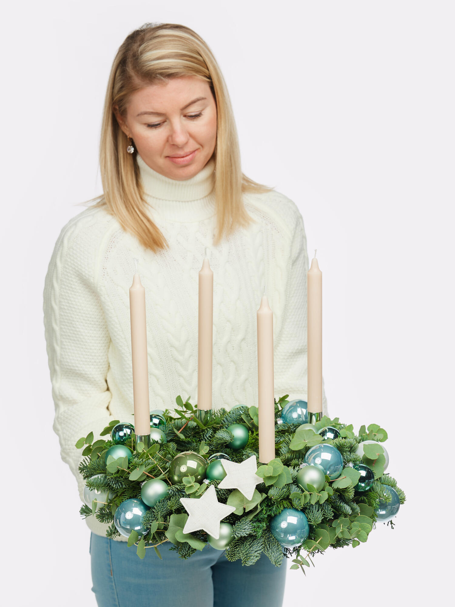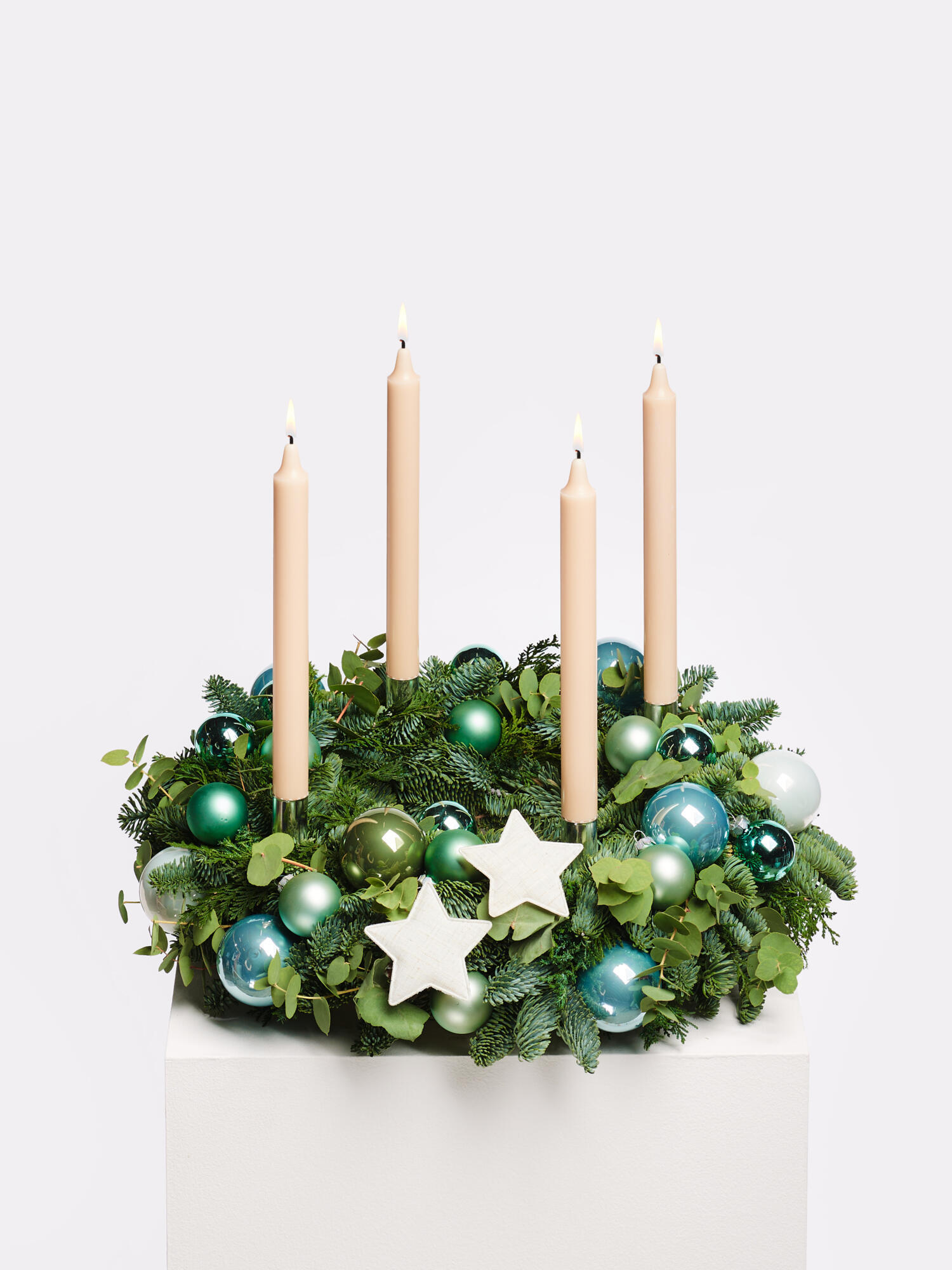 Überraschen Sie jemand Besonderes mit diesem festlichen Adventskranz aus frischem Nobilis-Tannengrün! Die Kombination aus Eukalyptus und vier sandfarbenen Stabkerzen schafft eine beruhigende, natürliche Atmosphäre. Die Weihnachtskugeln in Weiß, Salbei und Nebelblau sowie die sternförmigen Birkenholzstecker setzen weihnachtliche Akzente. Mit einem Außendurchmesser von ca. 40 cm ist der Kranz perfekt für den Tisch oder als Mittelpunkt der Weihnachtsdekoration geeignet. So wird die Adventszeit garantiert stimmungsvoll!