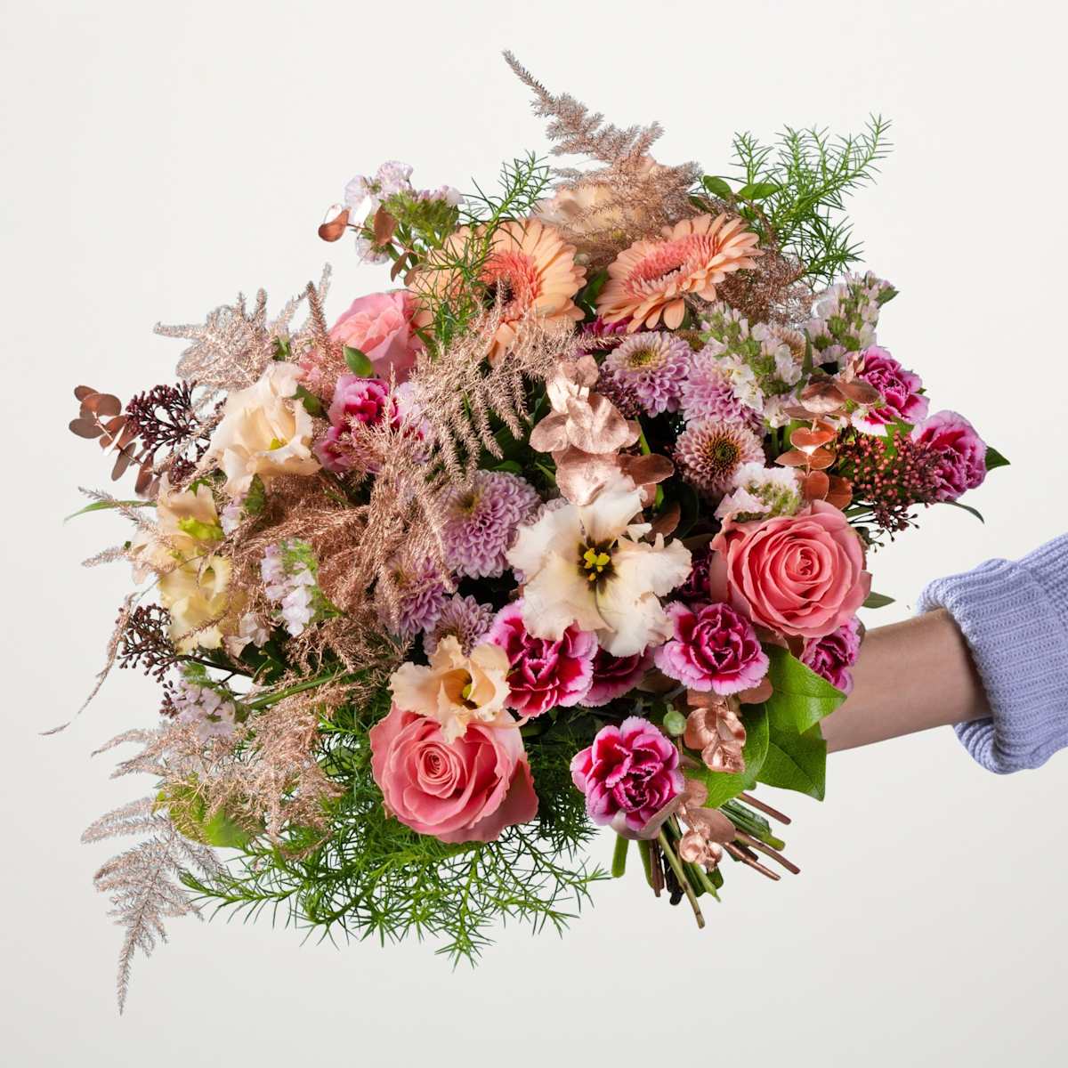 Leuchtende Farben und der Duft frischer Blumen streicheln die Seele. Und weil wir dir und deinen Lieben etwas Gutes tun wollen, haben wir den atemberaubenden Blumenstrauß Wintertraum zusammengestellt. Er ist ein wahres Blütenmeer aus Nelken, Chrysanthemen, Eustoma, Gerbera, Limonium, Skimmien und eleganten Rosen. Komplettiert wird das herrliche Arrangement von filigranem Asparagus, silbrigem Eukalyptus, Salal, Pistazie und winterlicher Sicheltanne. Hier vereinen sich Sommerfrische und Winterglanz auf schönste Weise. Welche Überraschung in der Weihnachtszeit könnte schöner sein? Also warte nicht lange und erfreue deine Herzensmenschen mit dem farbenprächtigen Kunstwerk aus frischen Blumen. Wir wünschen dir und deinen Lieben ein besinnliches Weihnachtsfest und alles Gute für das kommende Jahr!
