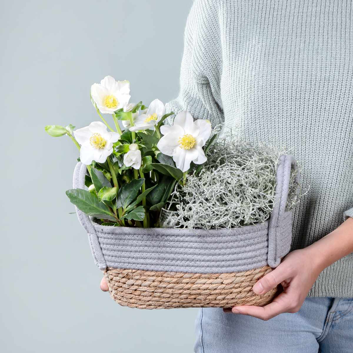 Unser hübsches Winterzauber-Duo mit Korb begeistert auch in der kalten Jahreszeit mit einer strahlend weißen Blütenpracht. Dies liegt an der herrlichen Christrose, die sich gemeinsam mit silbrigem Stacheldraht in einem ovalen Übertopf aus Korb befindet. Ihr Blattwerk ist dunkelgrün und bildet einen hübschen Kontrast. Die Wuchshöhe des Duos beträgt 26 cm und 30 cm. Du kannst die Schönheiten auch im Winter auf dem Balkon oder der Terrasse platzieren. Sie sind winterhart und benötigen keinen großen Pflegeaufwand. Gieße nur sparsam, denn Staunässe vertragen die beiden nicht. Wird die Christrose zu groß, kannst du sie später direkt in den Garten pflanzen. Sie ist eine edle Schönheit, an der du dich viele Jahre erfreuen wirst.