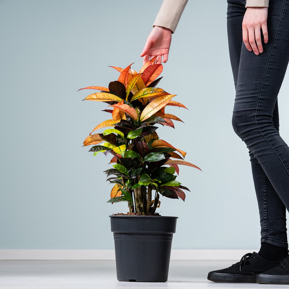 Wenn dir immer nur Grün nicht mehr reicht, wirst du mit dem Wunderbaum ‚Iceton‘ zwar nicht dein blaues Wunder erleben, aber bestimmt total von seiner Farbigkeit geflasht sein! Seine Blätter sind eine Mixtur aus grünen, gelben, orangenen und roten Farben. Und auch seine Ausmaße sind phänomenal, er schafft es immerhin bis auf 2 m Höhe, bei 1 m Breite. Vielleicht kennst du Codiaeum variegatum, so sein botanischer Name, ja auch als Kroton oder Wunderstrauch? Und übrigens, wenn du etwas mehr Farbe im Büro haben möchtest, der Wunderbaum ‚Iceton‘ steht dafür bereit.Der Wunderbaum ‚Iceton‘ muss regelmäßig gegossen werden. Wenn du darauf achtest, dass die Erde immer leicht feucht ist, belohnt er dich mit kräftigem Wuchs. Am besten kann er das an einem sonnigen bis halbschattigen Standort.