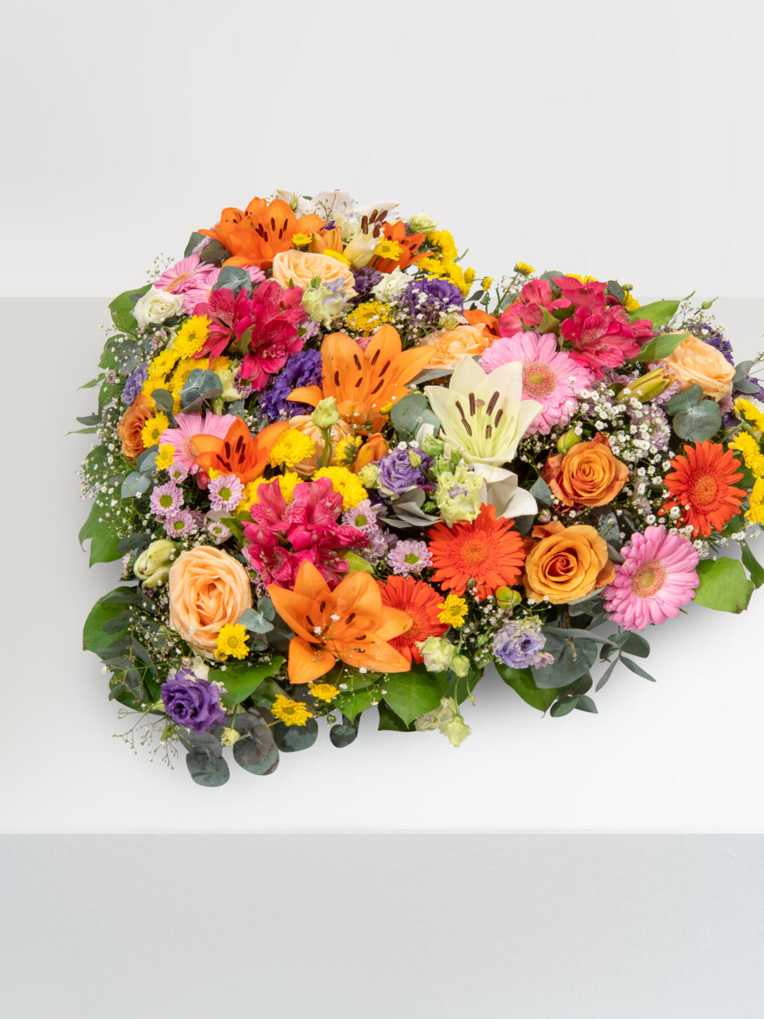 Trauergesteck in Herzform in Bunt mit Rosen, Germini, Alstromerien, Santini, Eustoma, Lilien und Schleierkraut. Als Beiwerk werden Eukalyptus, Salal und Efeuranken verwendet.