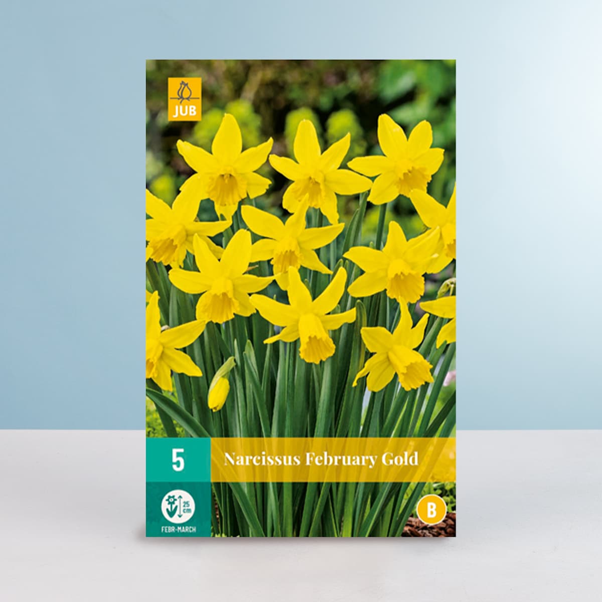 Wenn sie Frühling riecht, ist sie nicht mehr zu bremsen! Und so kommt es, dass die Zwerg-Narzisse ‚February Gold‘ spätestens im März ihre goldgelben Blüten den ersten Frühlingssonnenstrahlen entgegenstreckt. Übrigens kannst du dann auch den Frühling riechen, denn ihre Blüten sind zart duftend. Diese Vertreterin der Art Narcissus Hybrid wird etwa 30 cm hoch und 15 cm breit. Daher kannst du die 5 Zwiebeln, die du erhältst, auch wunderbar in Blumenkübel und Balkonkästen setzen. Hauptsache die Zwerg-Narzisse bekommt durchlässige Erde und einen windgeschützten, sonnigen Standort.